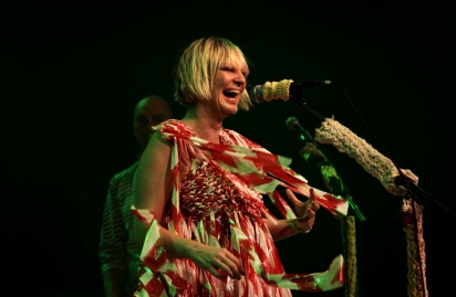 Jeg er nødt til at fortælle om en koncert, jeg var til i Vega i sidste uge. En sand humørbooster. Koncerten var med australske Sia Furler, og det var den sjoveste, smukkeste, varmeste og mest fantastiske koncert, jeg længe har været til. Sia er en lille kvinde med en stor stemme. Hende med musikken bag Nykredit-reklamen om at “tænke nyt”. Jeg har med stor fornøjelse labbet hendes musik i mig på min Ipod i lang tid, men jeg har aldrig oplevet hende live. Og hun gav mig bare den største overraskelse. Ind på scenen trådte en mellemting mellem en alf og en Ronja Røverdatter-rumpenisse. Hun må have tømt noget lager af rød-hvide afspærringsbånd hos Vejdirektoratet og brugt eftermiddagen på at hækle. Wow, for en kjole, se selv: