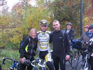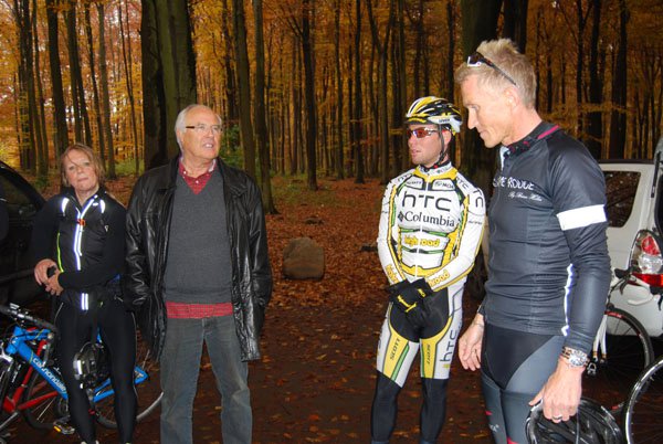 I dag skulle jeg så have en ordentlig løbetur i skoven. Ikke fordi der sker så meget ved at drosle helt ned en uge, men mest for at stive min runkne selvtillid af. Nå ja, og så trængte jeg da til en tur rundt i skoven, mens der endnu er blade og gyldne farver over det hele. Så det gjorde jeg. Løbe en 12-14 km i den disede morgenluft. Og så havde jeg travlt. Jeg havde nemlig en aftale med selveste Mark Cavendish og Brian Holm og en gruppe tidligere kræftpatienter på VM-ruten ved Geels Bakke mellem Holte og Virum.