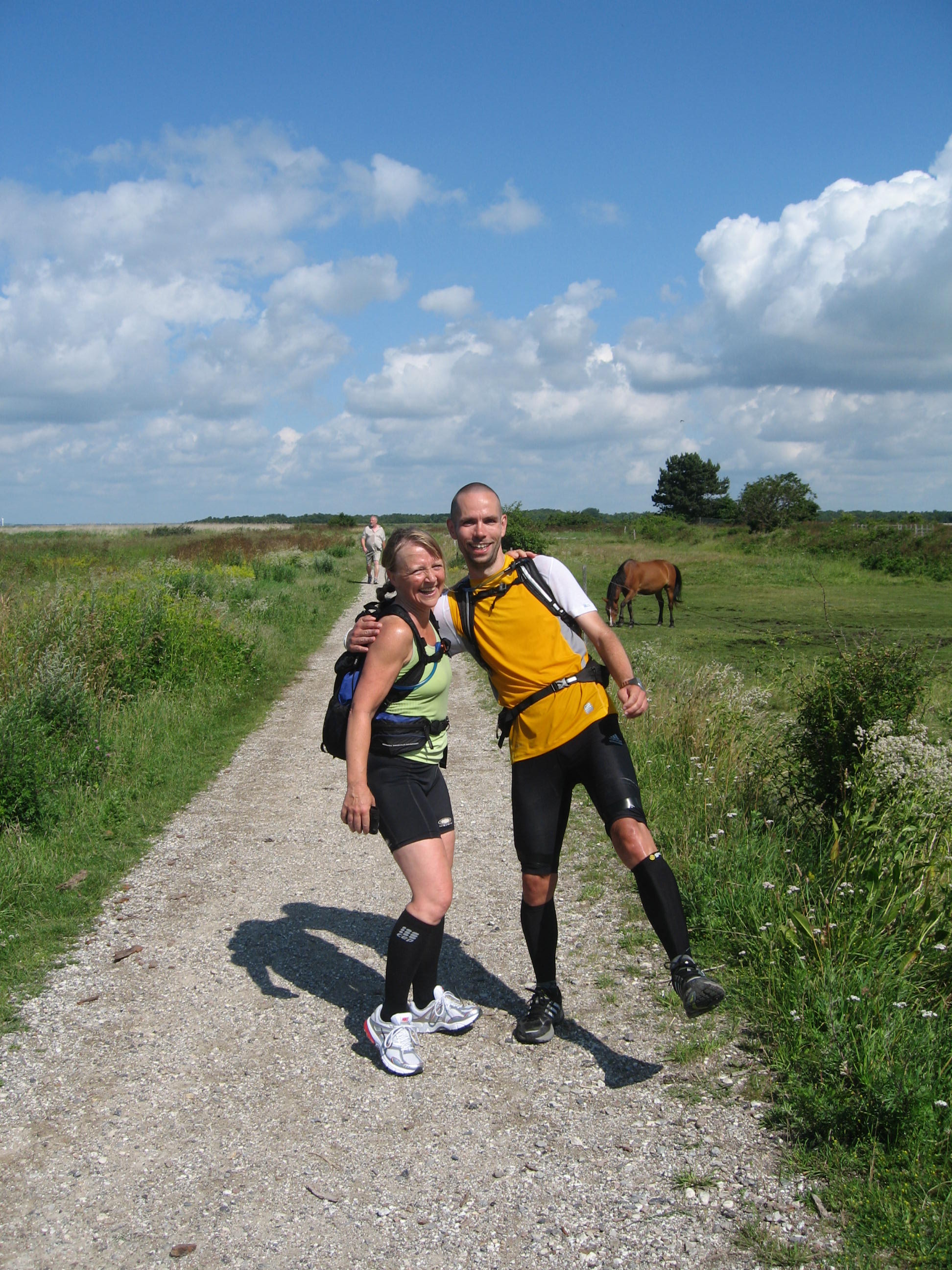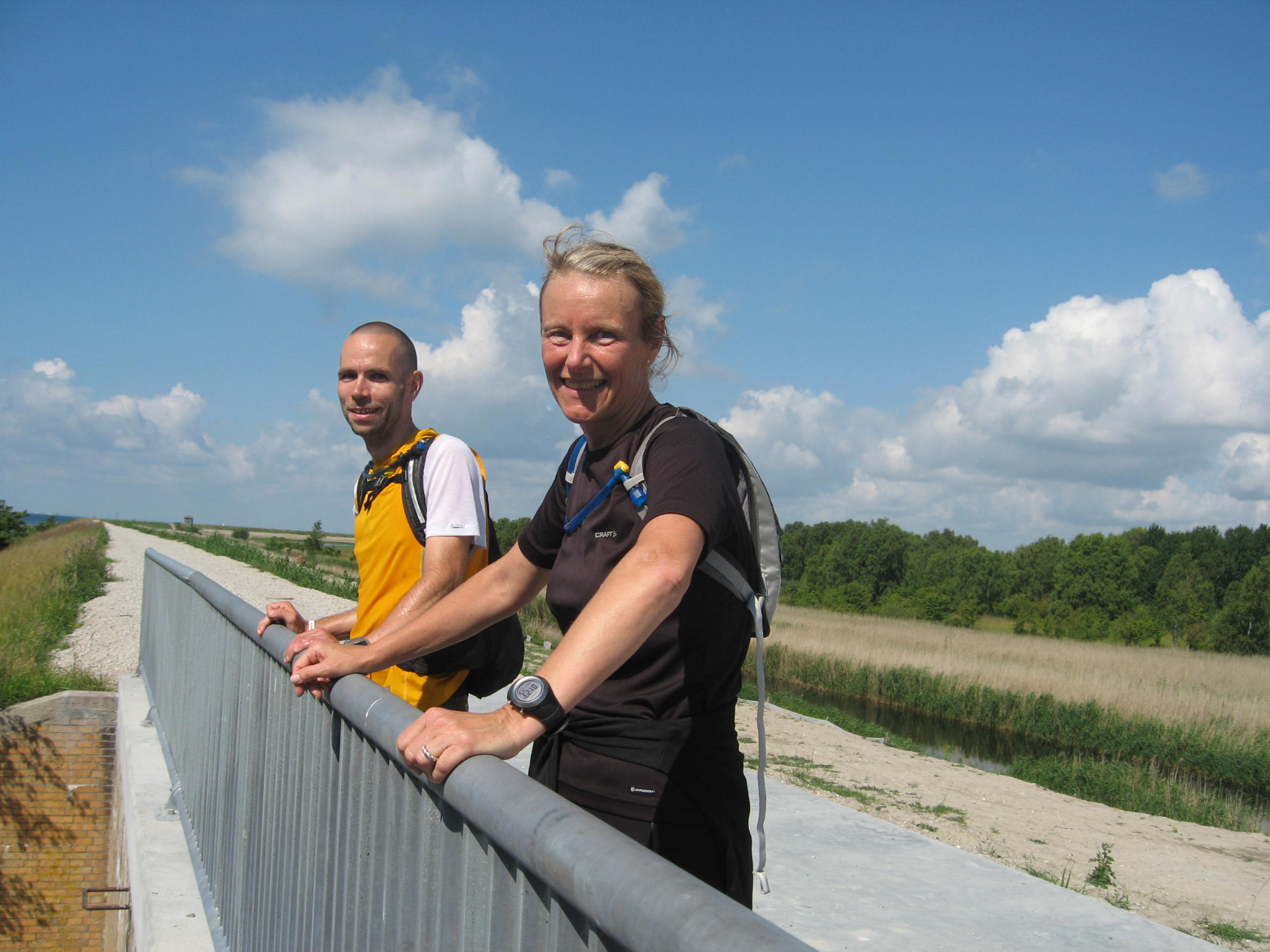 I morges fem minutter i ni skrev Jesper: Helle og jeg løber fra Bryggebroen nu og er hos dig om en halv time. Så jeg pakkede de sidste ting i rygsækken, snørede skoene og løb ud for at møde dem. I det dejligste morgensolskin. Og så drog vi afsted – rundt om hele Amager. Faktisk var jeg lidt spændt på turen efter mine pjevsede indlæg om manglende fart og form. Og følte mig sådan lidt hausfrautræt den første del. Jeg ville jo aldrig selv vælge at give Medina fuldt gas hele natten, vel? I det mindste kunne man vælge noget ordentlig musik. Men det gik over. Vi løb heller ikke stærkt. Og enten er Helle og Jesper guddommelige skuespillere, eller også var vi virkelig fælles om det tempo. Det var sådan en tur uden andre ambitioner end at komme hele vejen rundt. Og nå hjem til Tour de France. Og sofaen. Og vi stod stille, når vi skulle fylde vand og andet godt i maven. Vi nød udsigterne og viste Helle hele vejen rundt på Kalvebod Fælled. Som hun selvfølgelig syntes var smuk og guddommelig.
