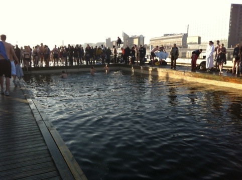 Årets sidste dag går på hæld, og jeg smutter ind til mesterkokken, min bonussøn, og holder nytår med hans familie. Tidligere i dag tog jeg imod en invitation fra Islands Brygges havnebad, trak i løbetøjet, smed håndklæde og tørt tøj i rygsækken og løb ind langs vandet. Ved havnebadet stimlede bunkevis af mennesker sammen, og det var en fest. Det var simpelthen ikke en mulighed at tøse ud med så mange tilskuere. Jeg trak resolut løbetøjet af. Og så stod jeg der i badedragt. Den 31. december. Tæt på frysepunktet. Der var kun én ting at gøre. At springe.