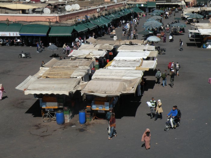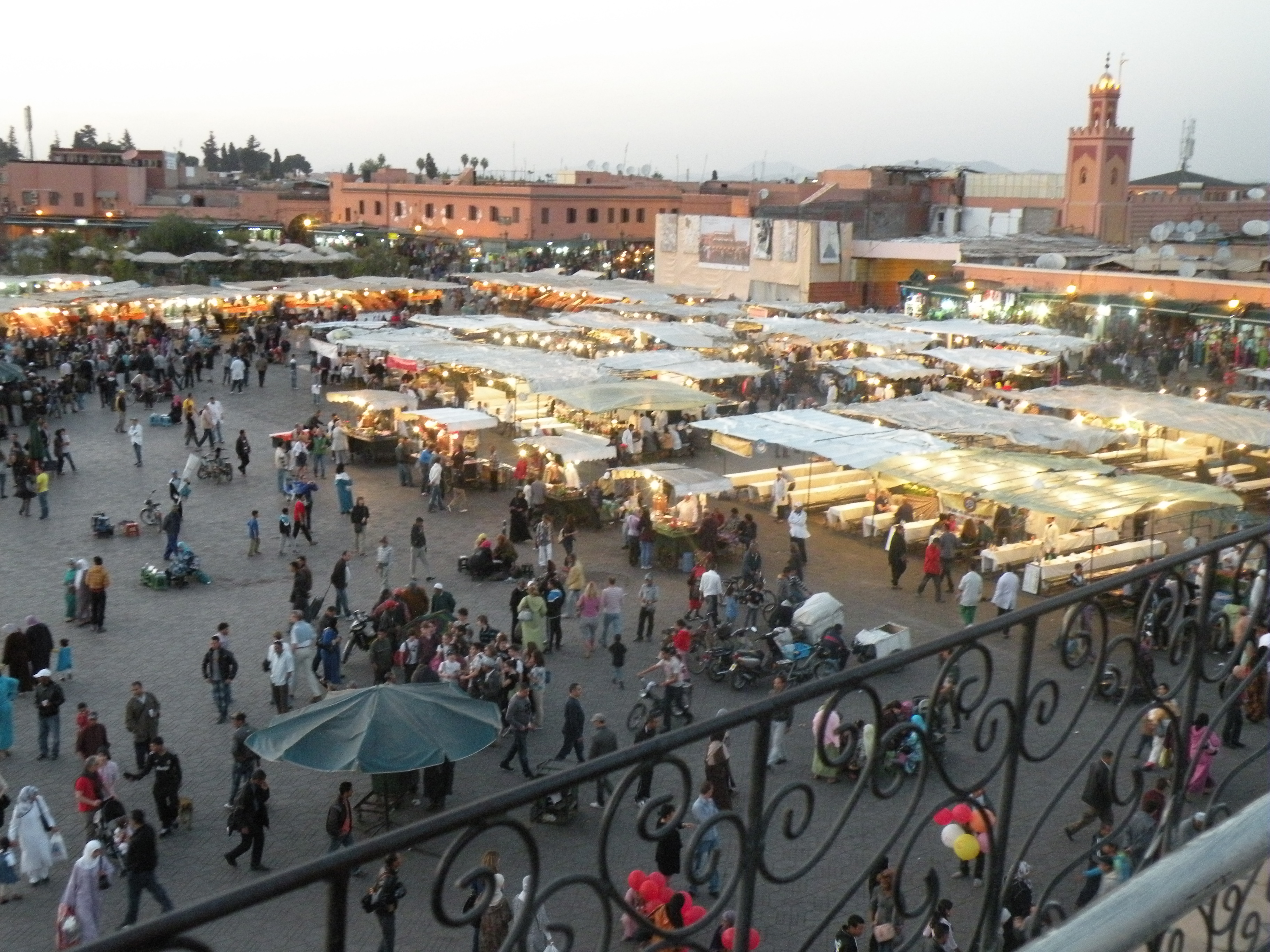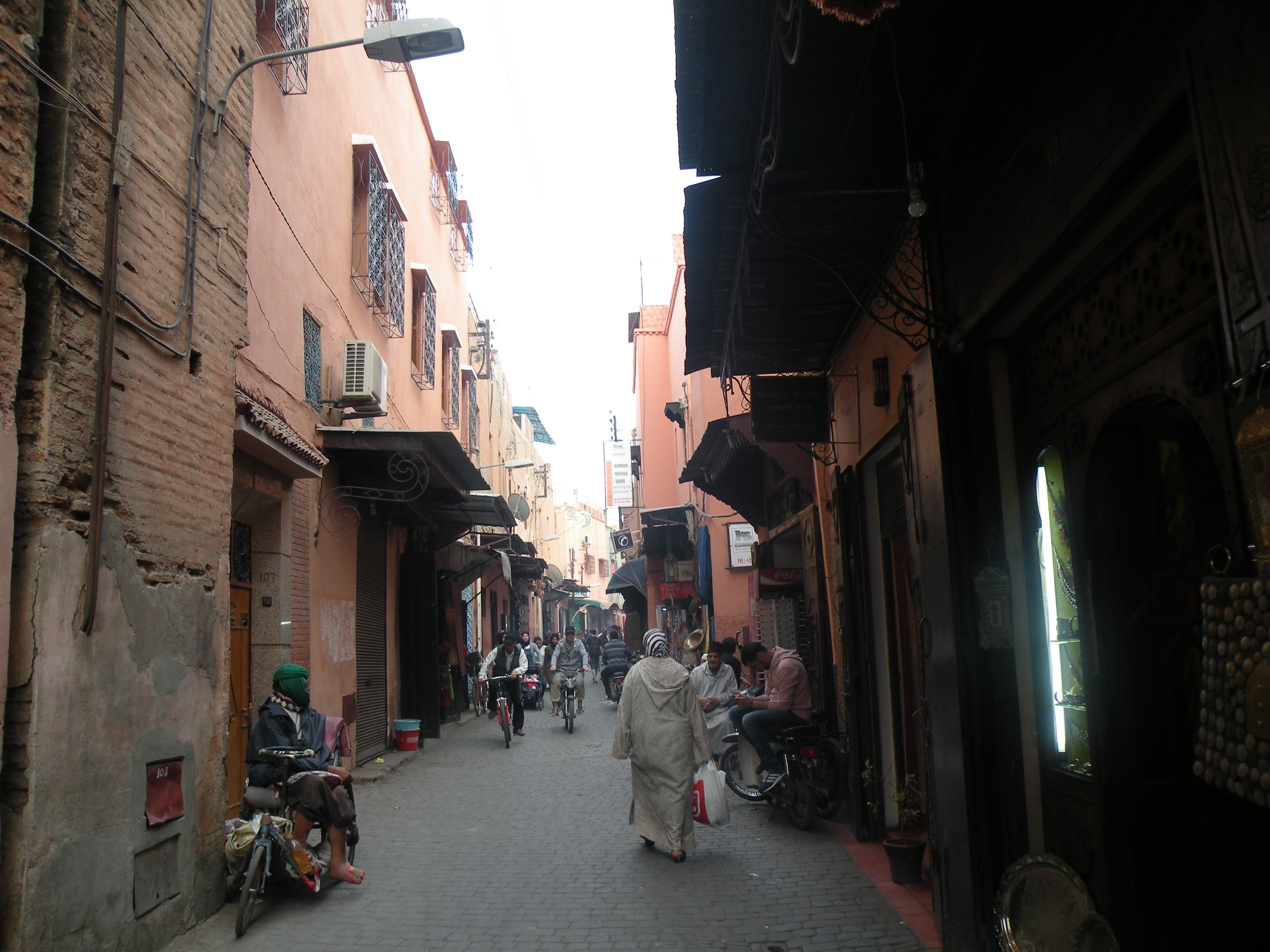 Men så var jeg klar. Medinaen er den gamle centrale bydel. Og den ER en labyrint. Man farer lynhurtigt vild. Og det bedste er bare at acceptere det. Det er ikke farligt, og man finder ud igen på et tidspunkt. Midt i overgangen til den nyere bydel ligger en kæmpe plads, Djeema el Fna, som altid er et godt orienteringspunkt. Her starter den omfattende souk, som er den marokkanske udgave af en bazaar. Her handles med alt fra dagligvarer til souvenirs. Pladsen emmer af liv fra morgen til aften. Om dagen af gadehandlere, gøglere og hennakunstnere. Om aftenen bliver den en frådende arena af madboder i knivskarp konkurrence. Her kan man få sit livs sjoveste måltider. Kokkene fra madboderne slås bogstaveligt talt om kunderne. Lokker med søde ord og gratis drinks. Der er grundlag for en god deal på et i forvejen billigt måltid.