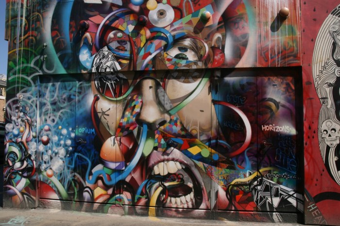 Jeg var kommet frem! Modtaget af en blå bamse. Jeg drejede ind ad den lille gyde, Clarion Alley og så mig måbende omkring. Der er ikke så meget at sige. Bare se.