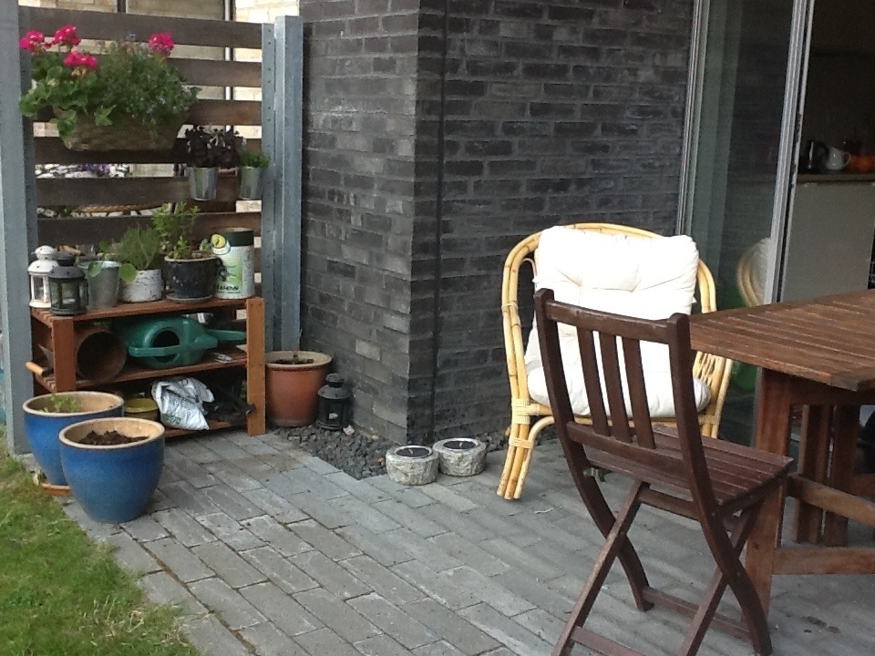 Nok om det. Så gik jeg agurk i blomster og pottemuld. Jeg plantede og ordnede og slæbte bunker af gammelt skrammel på genbrugspladsen overfor. Og smurte et tykt lag yndighed ud over hele min terrasse. Og fandt nuttethedskompetencer, som jeg ikke anede, jeg havde.
