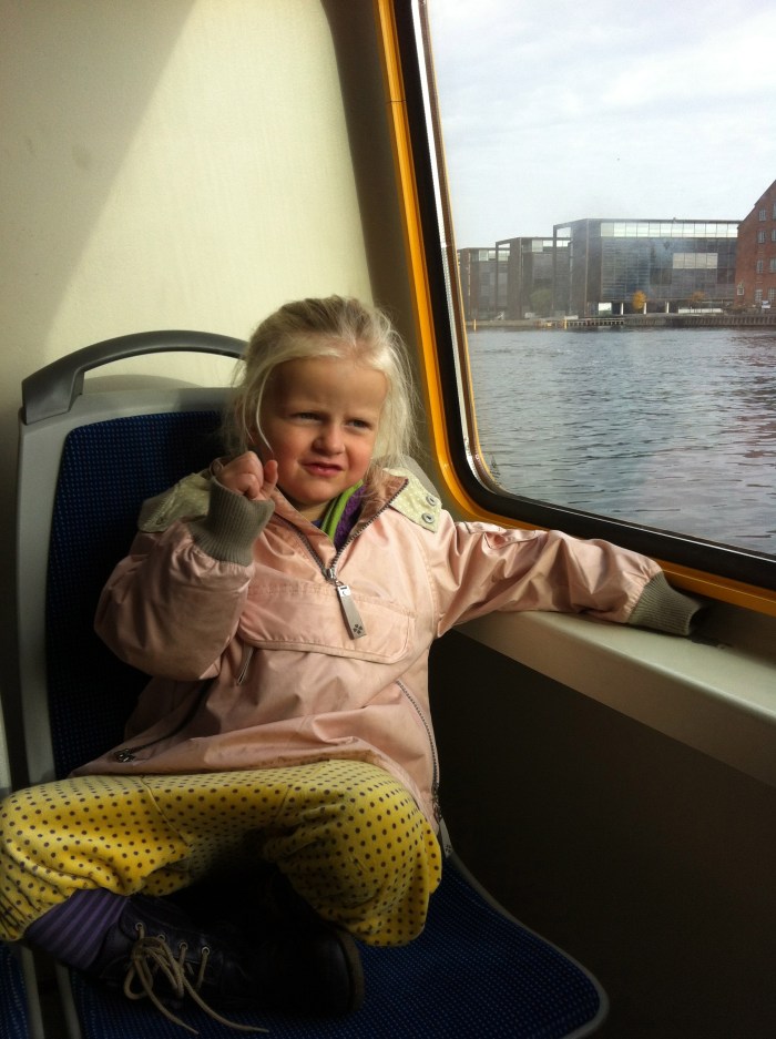Havnebussen på vej hjem fra en fredag fyldt med oplevelser på Nationalmuseet. Indianere gjorde ikke stort indtryk på hverken 5-årg eller 3-årig, men to granvoksne mænd, der flåede skindet af et rådyr, fik munden til pludselig at stå stille. Kender du ikke børnemuseet på Nationalmuseet, så skrub en tur derind. Det er gratis, det er fantastisk, det er fyldt med oplevelser. Også uden børn, når man er barnlig nok.