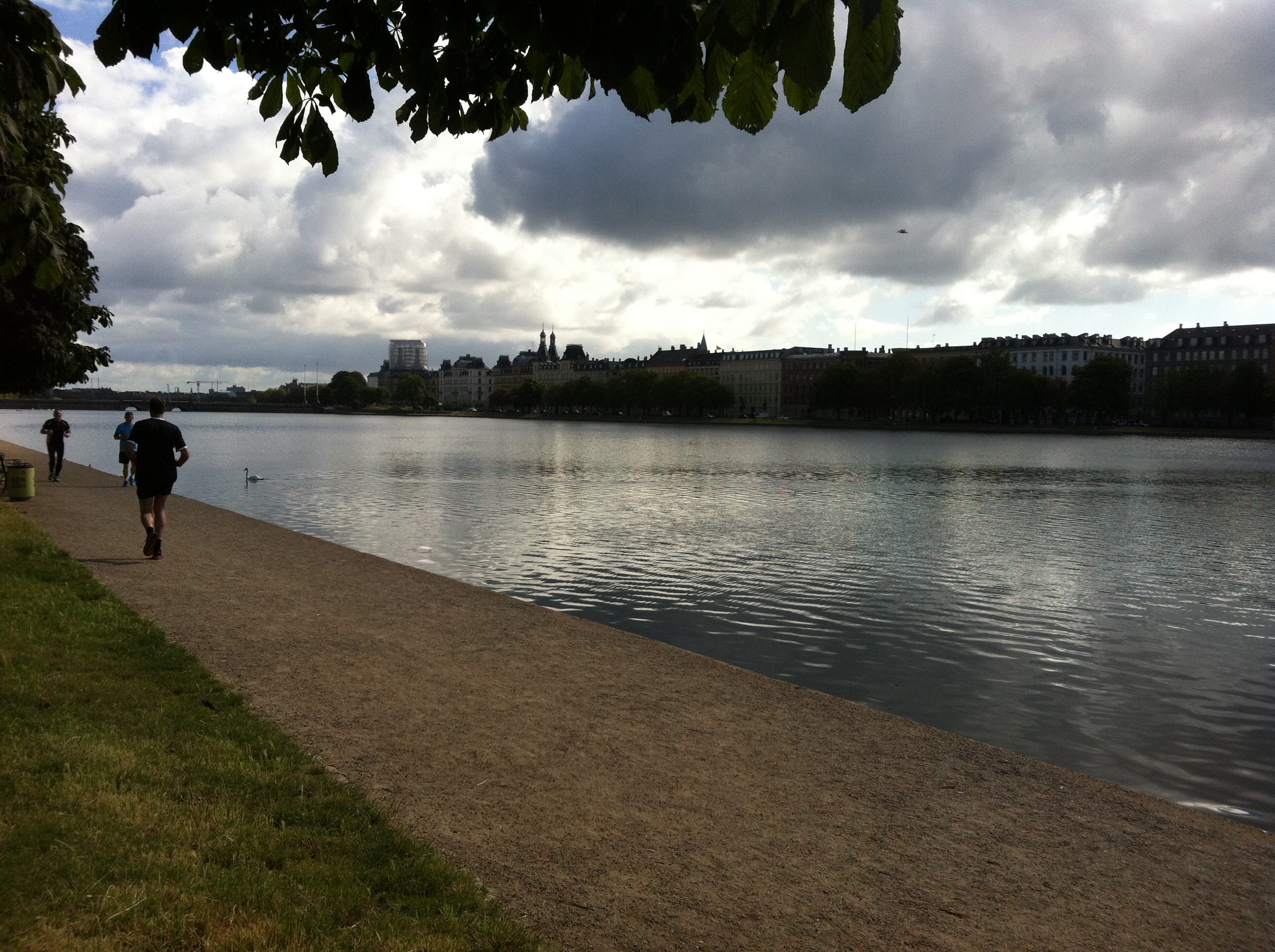 Videre gennem Det Ny Teater og gennem fredelige Vodrofsvej til helvedeskrydset ved Åboulevarden, hvor jeg slipper over til søerne. Hvor der igen hersker fred. Jo, der er mange cykler, men ikke kaos. Folk løber morgenture, og børn cykler med deres forældre. Jeg elsker at cykle her.