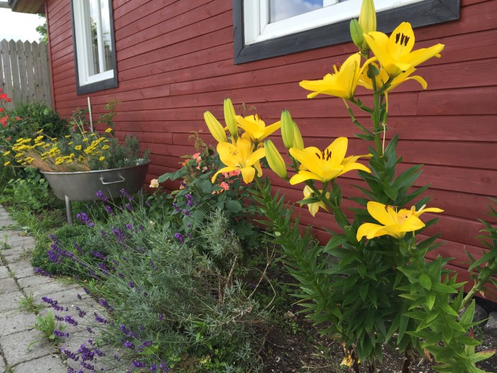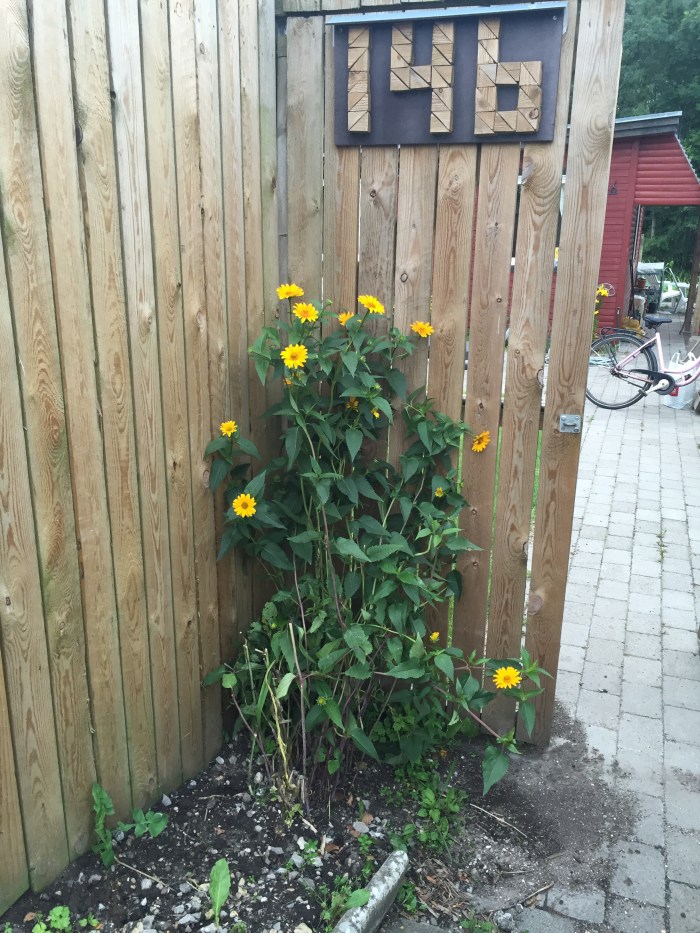 Sådan er livet i haveforeningen. Vi blander os. Og blander blomster. Og nu står Astrid Lindgren helt passende under mit stuevindue. Og en kæmpestor gul blomst pynter ved indgangen til min have.
