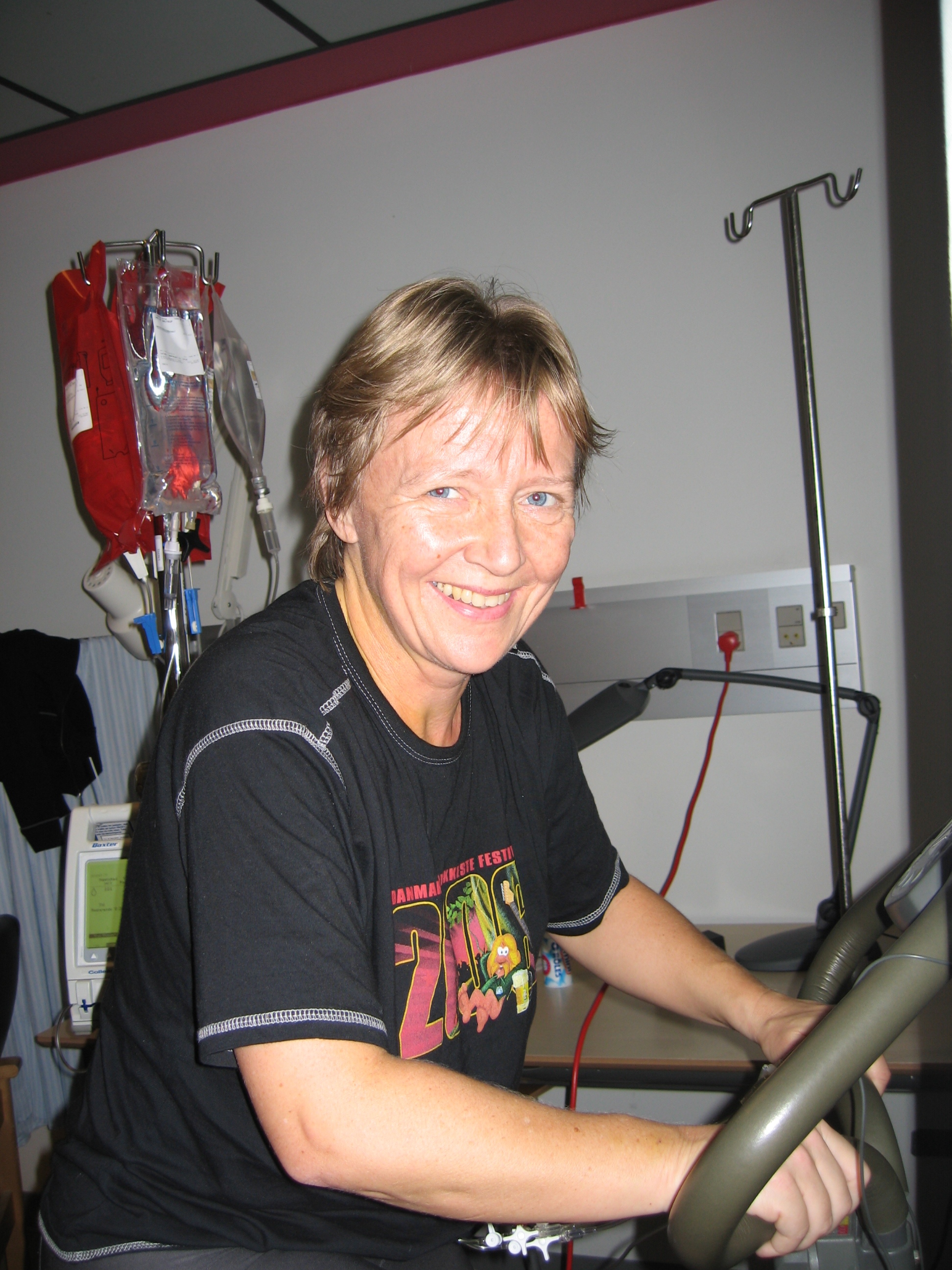 Jeg havde nogle gode venner i København, der lavede noget nyskabende forskning om hård træning til mennesker i kemoterapi. De sendte mig bunker af artikler og lavede et træningsprogram til mig. Selvom de var lidt usikre på det, fordi jeg havde en hæmatologisk sygdom. Det, der kan være betænkeligt, er, at hver behandling får knoglemarven til at slukke for al aktivitet. Og det er i knoglemarven, blodets vigtige celler bliver lavet. Det betyder, at man kommer til at mangle røde blodlegemer, der transporterer ilt rundt i kroppen; man kommer til at mangle hvide blodlegemer, der bekæmper bakterier og virus i kroppen og endelig kommer man til at mangle blodplader, der er vigtige for at få blodet til at størkne. Jeg ville altså uendelig let kunne få blødninger. Men jeg turde ikke holde op med at træne.