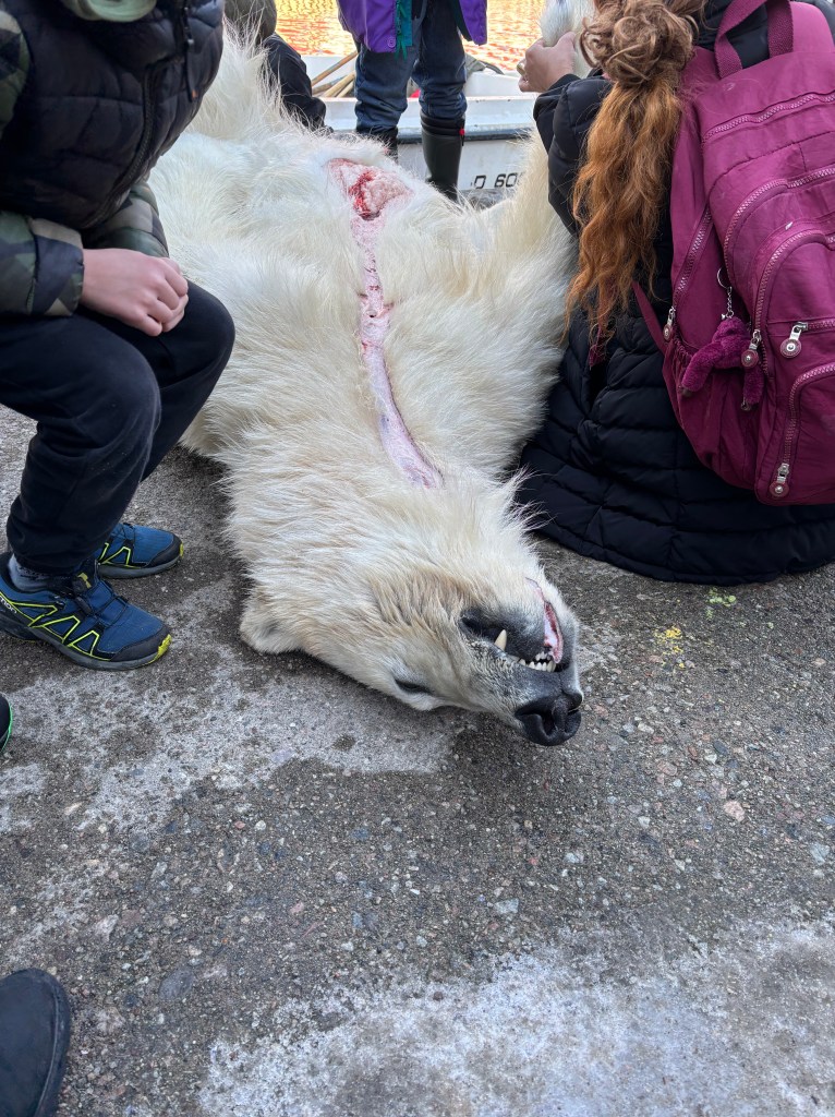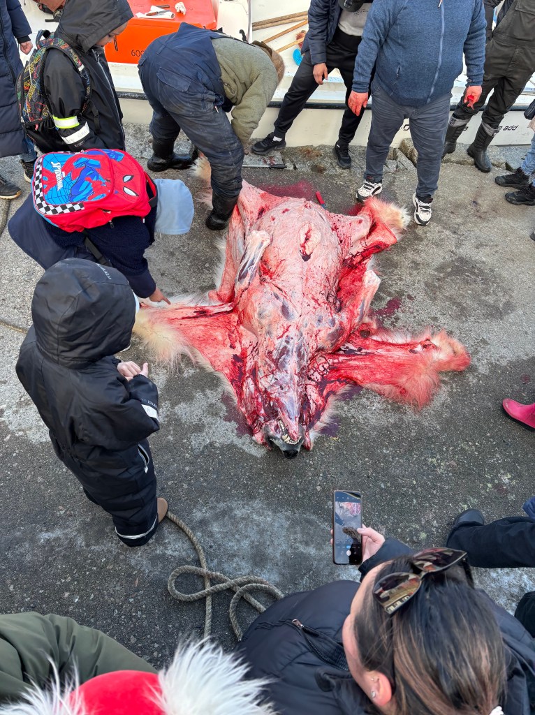 Det er også sådan, at alt ved isbjørnen bliver brugt. Skindet blev flået, mens vi stod der. Det bliver behandlet og brugt. Bagefter bliver alt kød skåret ud og solgt og spist. Ikke af mig, for det lugter fælt og er fyldt med trikiner, så det skal koges i to tempi i mindst fem timer. Men for byens indbyggere er det en delikatesse. Den følgende dag mødte vi flere, der kom med bæreposer med isbjørnekød, som de glade viste os. Knogler og tænder bliver brugt til figurer og smykker. Det samme gælder for sæler. Jeg køber med god samvittighed ting med sælskind, for jeg ved, at sælen har levet et godt liv, og at den er blevet spist. Her kan man sende danske mink en tanke.