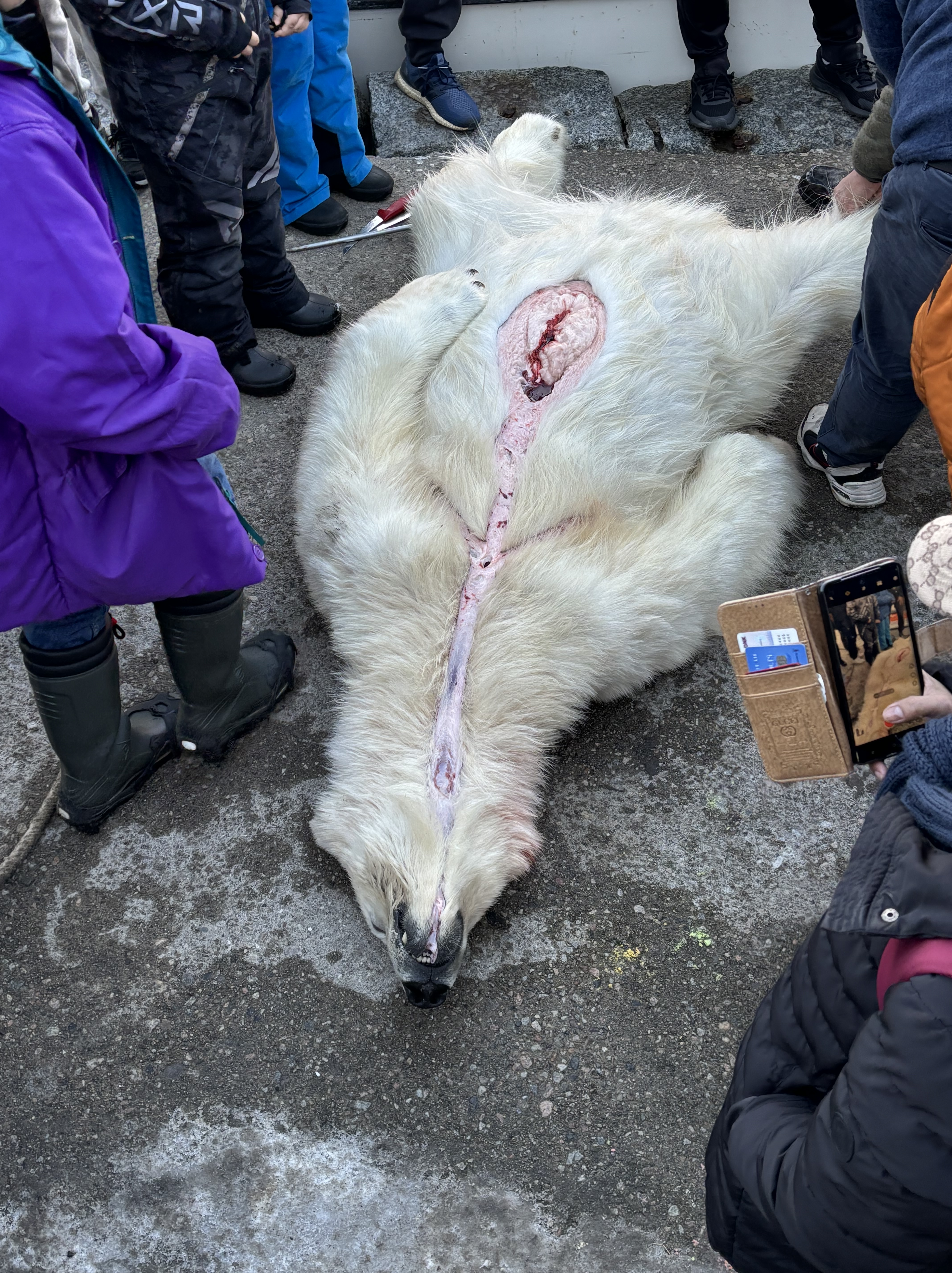 Det er også sådan, at alt ved isbjørnen bliver brugt. Skindet blev flået, mens vi stod der. Det bliver behandlet og brugt. Bagefter bliver alt kød skåret ud og solgt og spist. Ikke af mig, for det lugter fælt og er fyldt med trikiner, så det skal koges i to tempi i mindst fem timer. Men for byens indbyggere er det en delikatesse. Den følgende dag mødte vi flere, der kom med bæreposer med isbjørnekød, som de glade viste os. Knogler og tænder bliver brugt til figurer og smykker. Det samme gælder for sæler. Jeg køber med god samvittighed ting med sælskind, for jeg ved, at sælen har levet et godt liv, og at den er blevet spist. Her kan man sende danske mink en tanke.