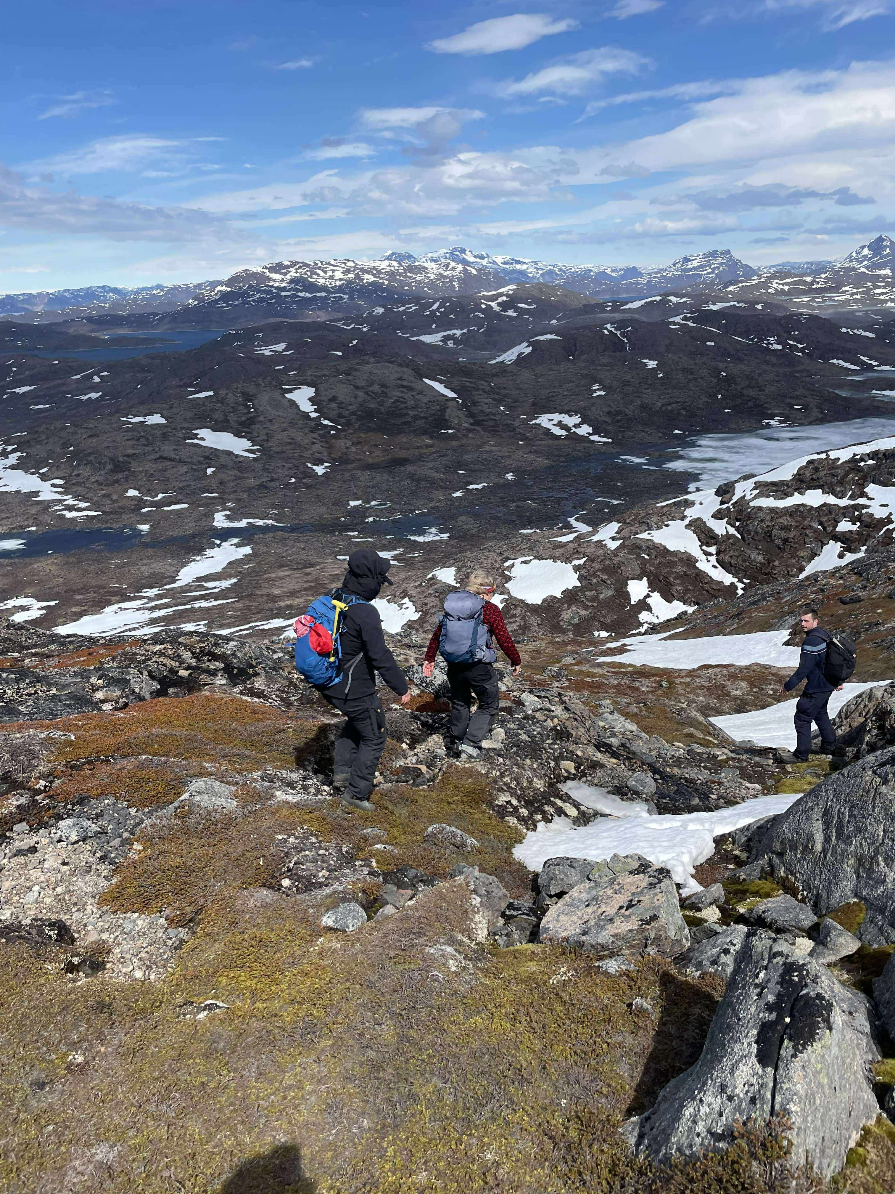 Søndag morgen havde vinden lagt sig meget, og nogle af os besluttede at gå en lang tur ud i fjeldet. En anden vej end lørdag. Vejret var lunt, og vi gik langs Storsøen, som nu havde bølger i stedet for is. Vi fortsatte til fantastiske scenarier og kunne efterhånden se indlandsisen i det fjerne. Det giver mig altid en følelse af ærbødighed for verden.