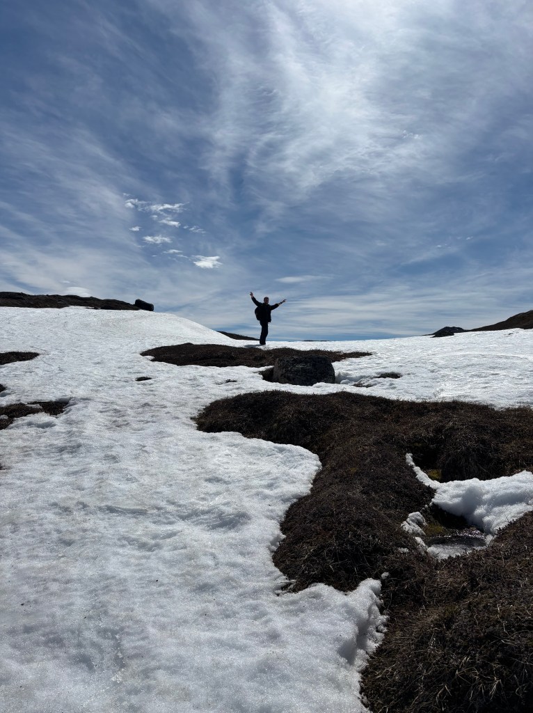 Vi besluttede at ændre rute i det gode vejr og gå op på Nordfjeldet. Men vi havde ikke indgået en pagt med universet, som omgående sendte stærk vind direkte i vores ansigter. Det blev hårdt, lad mig bare sige det lige ud. Og vores larmeredskaber til eventuelle isbjørne ville aldrig have overdøvet vinden. Men vi kæmpede os frem, indtil vi besluttede, at vi også kunne gå ned fra fjeldet og følge søen tilbage. Min frisure fortæller lidt om vind.