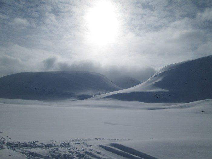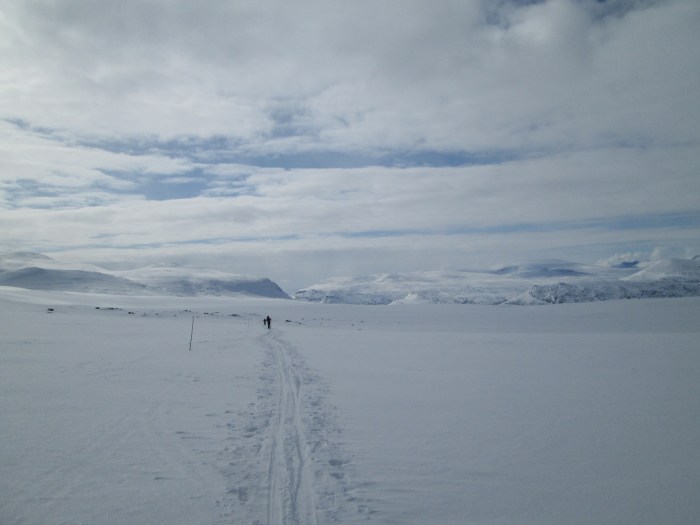 På den måde ankom vi et døgn forsinket til Abisko i Nordsverige. Og for at indhente lidt af det forsømte, løb vi med det samme videre til den næste hytte. Turen var i gang. Nu fulgte ni dage med meget blandet vejr. Det vekslede fra plusgrader til 16 graders frost. Vi havde blæsevejr, snevejr, tåge, høj sol og blå himmel. Hver dag gik vi på ski fra hytte til hytte. De fleste dage i vidunderlig ny pulversne. De fleste dage var vi helt alene i det store fjeld. Vi arbejdede os ind i en meditativ rytme på skiene. Arme og ben arbejdede sammen, og rygsækken voksede gradvist sammen med kroppen. Vi var helt udenfor mobilrækkevidde og var fuldstændig uforstyrrede i den store hvidhed. Af og til brød mine manglende skikompetencer roen, når jeg tumlede rundt som en gigantisk skildpadde. Men de fleste dage foregik oprejst.