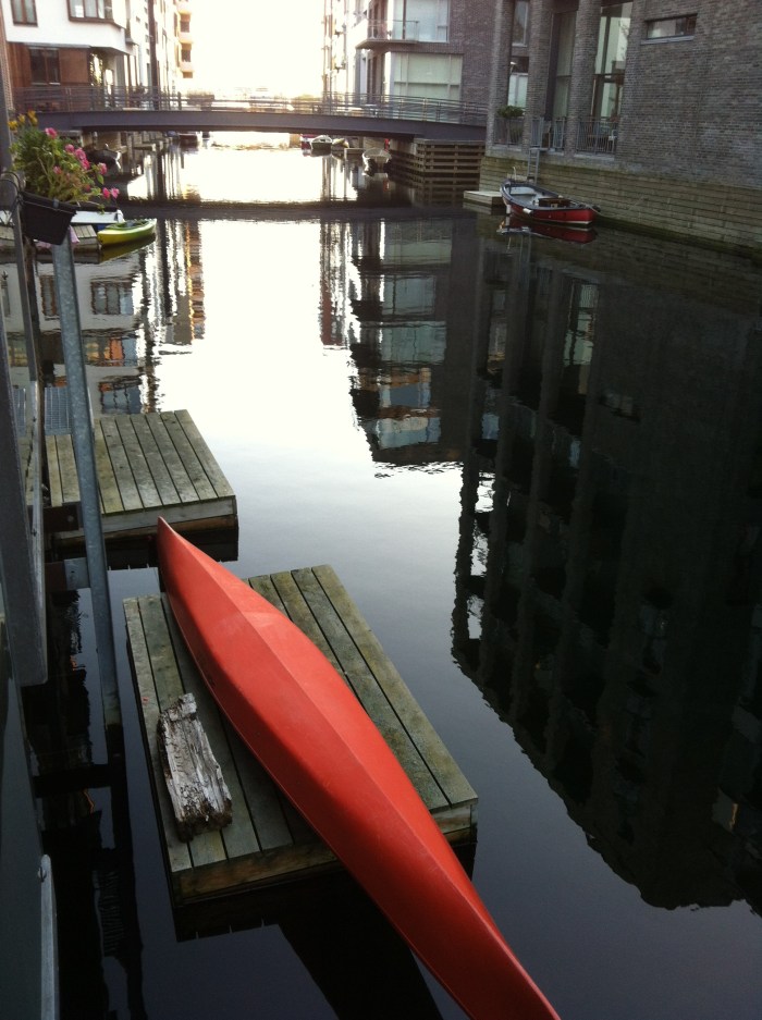 Båden ligger her stadig. Og nu begynder en svag følelse af omsorg at vokse frem. Den ligger jo helt udsat, der midt i kanalen. Og bliver langsomt fyldt med regnvand. Om lidt trækker jeg den ind til siden og fortøjer den til den rigtige bådplads, der også er udenfor min stue. Så den ikke bliver sejlet i stykker.