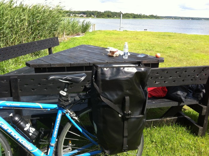 Det lykkedes mig at sove fra grisefest og fællessang på Guldborg Camping, så jeg tidligt næste morgen kunne glide ud af soveposen og pakke mine nordgående sydfrugter. Sagde pænt farvel til min lille lejrplads og krydsede endnu en bro til Falster. Som virkede næsten ligeså spændende som Lolland. Heldigvis skulle jeg kun krydse det øverste venstre hjørne, inden jeg ramte Storstrømsbroen. Var det ikke den bro, der blev lukket, fordi den ikke var blevet vedligeholdt? Sådan så den også ud. Man blev helt beklemt, når en lastbil eller et tog rumlede over og fik alt til at sitre.