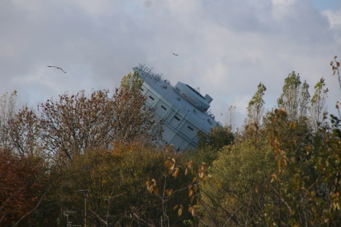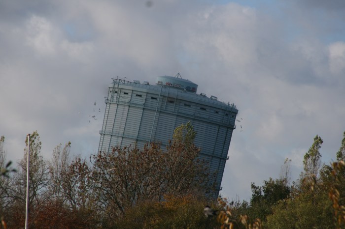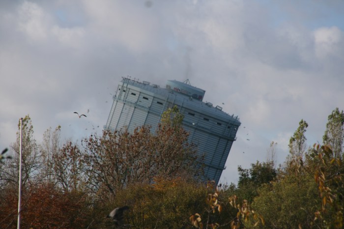 Egentlig havde jeg sagt mit farvel til det blå gastårn. Og så blev jeg alligevel helt sådan barnligt tændt på at opleve eksplosionen. At se det store tårn lægge sig helt tæt på. Noget med brag og ild og røg. Derfor trådte jeg i pedalerne for at nå frem i tide. Og det gjorde 20.000 andre også. Den slags opmærksomhed er Sydhavnen slet ikke vant til. Og jeg opgav at komme helt tæt på. I stedet trak jeg mig tilbage sammen med andre sydhavnere på en bro ved en af haveforeningerne. Her stod vi så og piskede en stemning op sammen. Med fin udsigt til det blå tårn. Jo, jeg blev sgu sådan lidt trist. Vi talte ned sammen. Jeg indstillede kameraet, og pludselig kunne vi høre sirenen. Fuglene omkring os havde luret ugler i mosen og flagrede omkring os. Lidt røg fra toppen af tårnet, og så lagde det sig langsomt og værdigt. Og braget kom tumlende lidt efter.